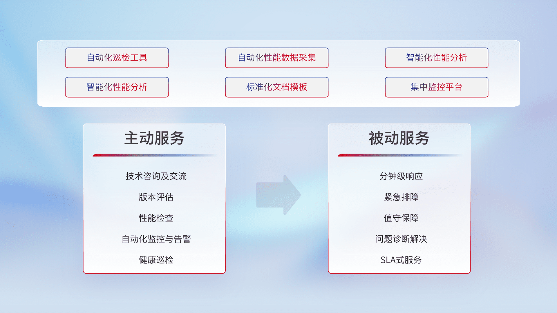 智能化工具和标准化文档,,,,保障服务质量,,,,提供主动服务(包含技术咨询、、、、版本评估、、性能检查、、、、自动化监控与告警、、健康巡检)和被动服务包含(分钟级响应、、、紧急排障、、值守保障、、问题诊断解决、、SLA服务)。。