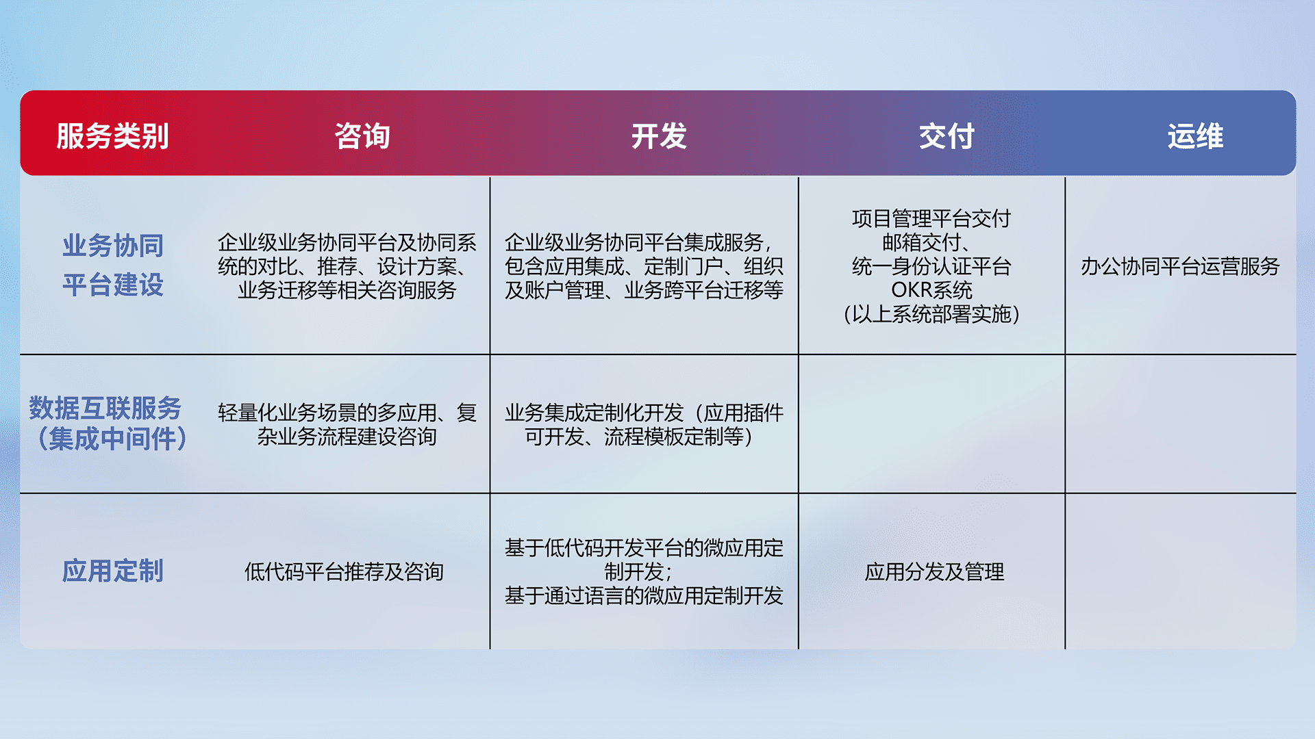 针对钉钉、、、企微、、IDaas等平台级产品提供产品的规划、、方案、、交付、、、定制化开发等服务,,,,实现如统一协同办公、、、智能客户服务、、、、混合会议管理、、、、智能数据查询、、等业务场景,,,,实现数字化转型。。